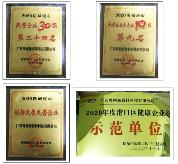 年终岁首,喜报频传。广西粤桥新材料科技有限公司接连获得“2020防城港市民营企业 30 强”、“2020 防城港市民营企业制造业 10 强”、“2020 防城港市创新发展民营企业”和“2020 年度港口区健康企业示范单位”等荣誉。