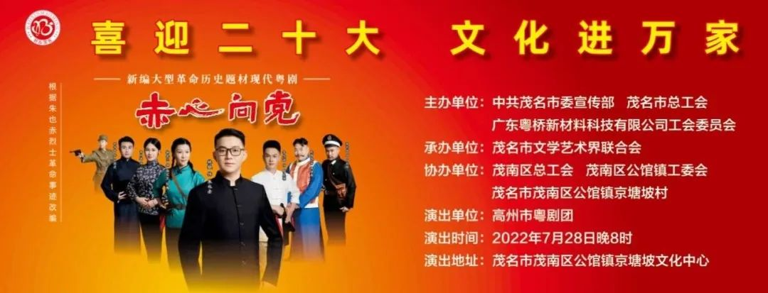 为进一步丰富广大职工的业余文化生活,正确引导世界观和价值观,切实推进党史的学习,7月28日晚,由中共茂名市委宣传部、茂名市总工会、广东粤桥新材料科技有限公司主办、高州市粤剧团新编演绎的大型革命历史题材现代粤剧《赤心向党》在茂南区公馆镇京塘坡村好心广场精彩上演。